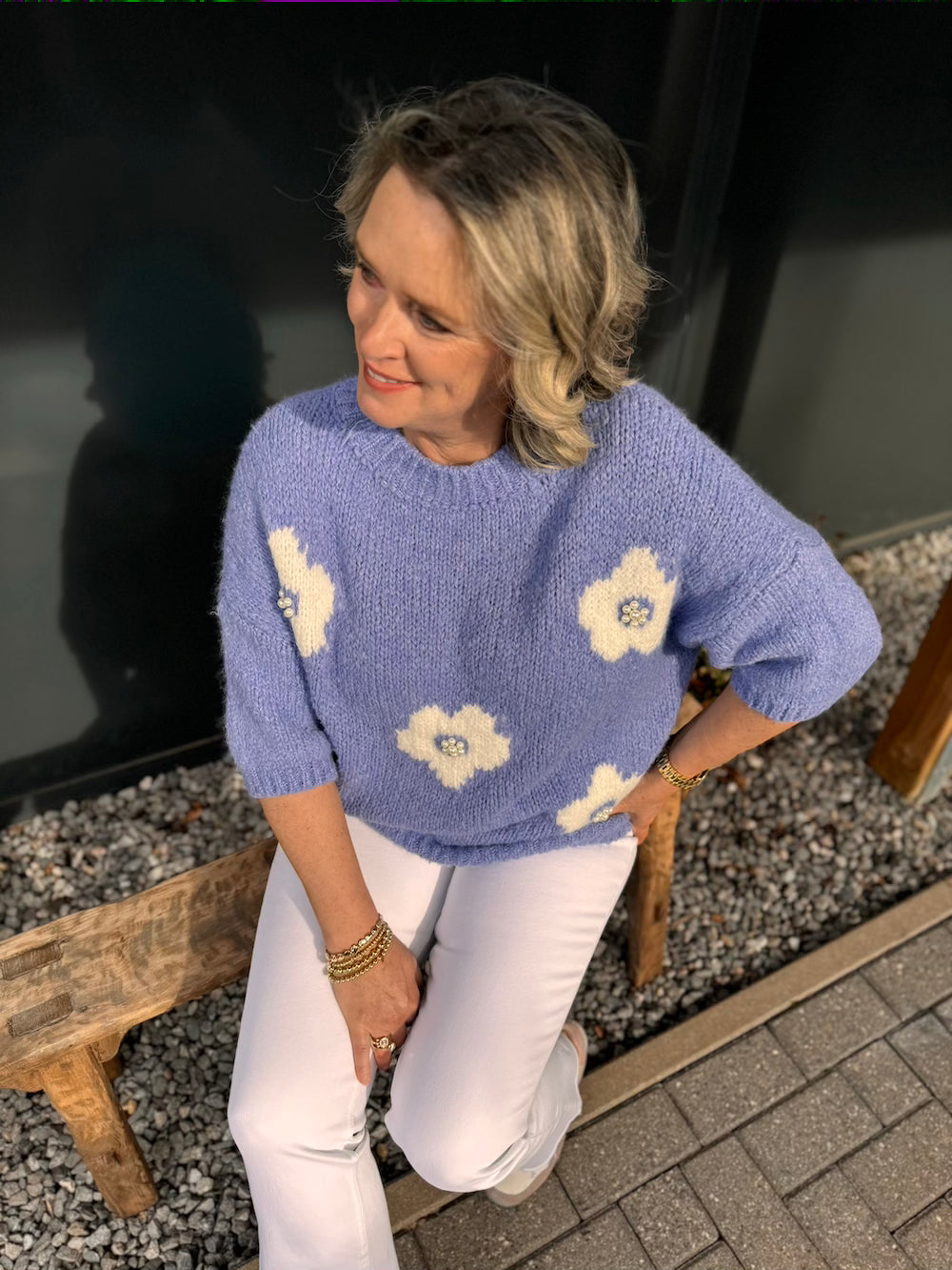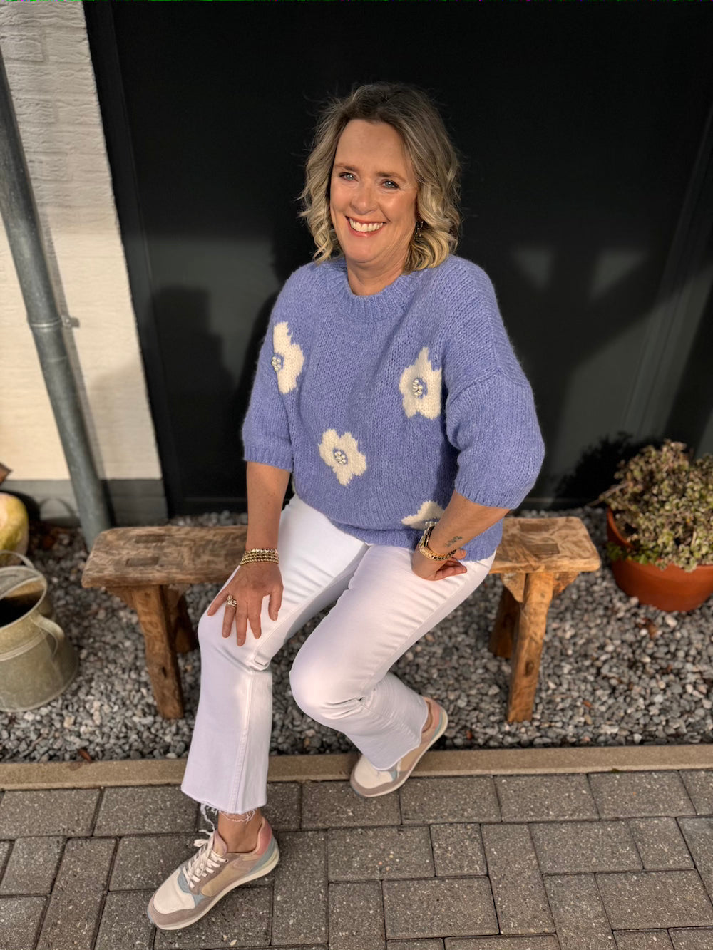 Wauw!! Zoek je een trui met detail? Deze trui met korte mouw heeft niet alleen bloemen maar het hart van al deze bloemen bestaat uit pareltjes.